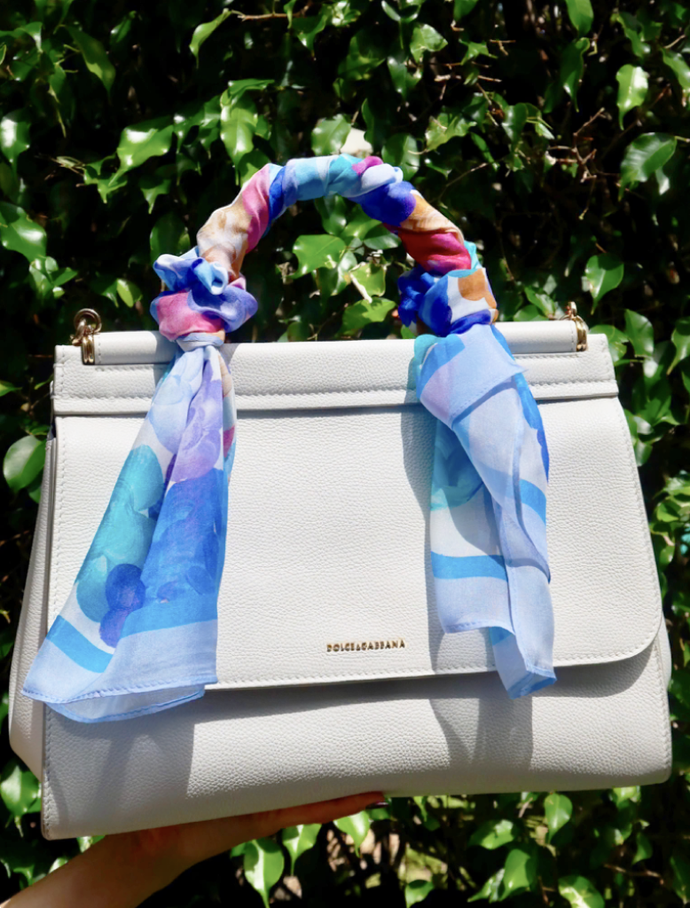 Crafted from luxurious silk chiffon, the scarf offers a sensory delight, combining softness and lightness that gently caresses the skin while showing off the exquisite floral design. Silk chiffon, known for its sheer elegance and airy texture, lends a delicate transparency to the artwork, giving the colors a soft, luminous quality. The bubbliness of the fabric adds an element of playfulness to the wearer’s experience, creating a whimsical sensation that echoes the joyful subject of the painting.